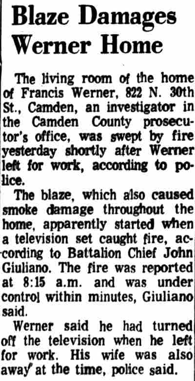 1968 Matthew Mengle Camden Courier-Post FIREMAN enters home at 917 North 30th Street., Camden, where blaze broke out in first-floor living room early today and caused extensive damage. Acting Battalion Chief Leonard Oshushek said the fire apparently was caused by careless smoking. Matthew Mengle,’ owner and occupant of the 21/2-story frame dwelling, arrived home to find firemen fighting the blaze. |