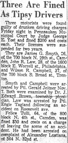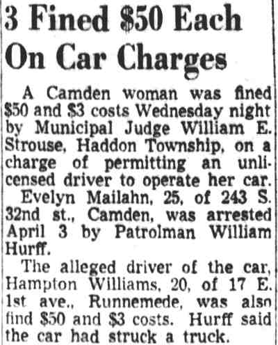 Millville, June 11-Edward Mitchell, 19, of 1157 North Thirty-second street, Camden, was arrested on Delsea Drive this afternoon by State Trooper Frank O'Brien, of Port Norris, on a charge of driving without a license. The youth said the car was his father's. He was fined $5 by Mayor Harry F. Van Hook and was held here until members of his family identified him. A young woman companion was sent home on a bus. |