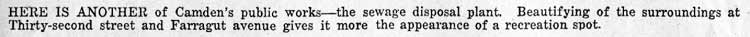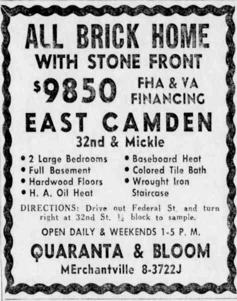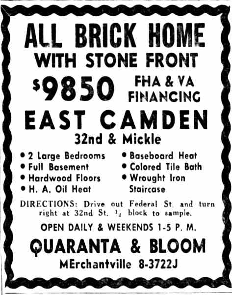 THIRTY-SECOND STREET runs from the Delaware River south, across River Road to the Pavonia railroad switching yards, bisecting the Cramer Hill neighborhood. It starts again in East Camden at Lemuel Avenue Street and goes to Federal Street, interrupted only by the railroad tracks at Rosedale Avenue. From Federal Street it runs to the city limits at Highland Avenue. As with all numbered streets in Camden, all buildings north of Federal Street carry a North 32nd Street address, while those south of Federal carry a South 32nd Street address. In the 1930s, at the corner of Westfield Avenue and 32nd Street was an acre of cultivated land on which was an old house called the "Mansion". This was razed to make room for the Westfield Acres public housing project and the land on which it stood was bought for $6,000. In the late 1960s a 10 story high-rise building for senior citizens was also built on this site. The "Acres" was razed in 2000 and a neighborhood of new homes, known as Baldwin's Run, now occupies the site. In the 1980s and 1990s, the corner of North 32nd and Saunders Street, whish was an exit from out of the Westfield Acres project, became one of the most notorious drug corners in East Camden. At least one murder took place on this corner during these years. |