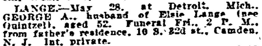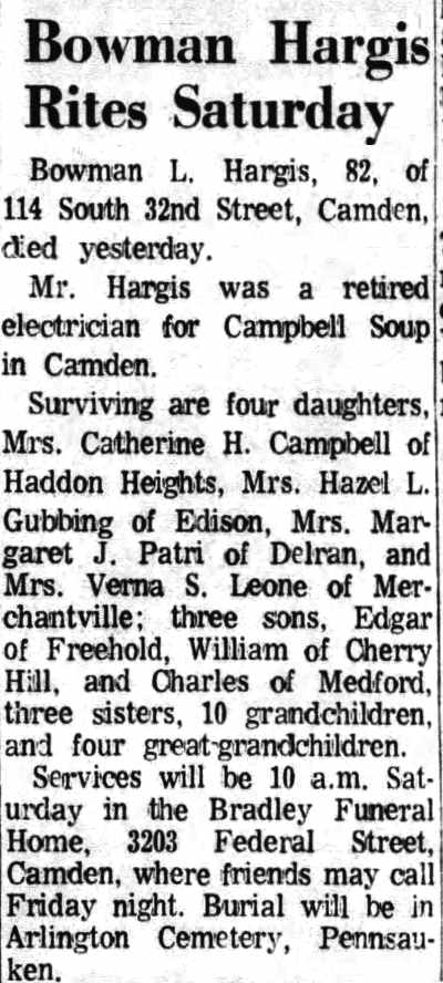 BINGEMANN, 70, DIES AT EAST CAMDEN HOME The funeral of George J. Bingemann, 70, for 40 years a resident of East Camden, who died Tuesday, will be held at 2 p. m., tomorrow at his home, 211 South Thirty-second street. He had been ill several weeks. Bingemann retired 10 years ago after conducting a bakery at Twenty-fifth and Federal streets for 25 years. He was born in Germany and was a baker there before coming to this country 52 years ago. He is survived by his widow, Maria H. A. Bingemann, six sons, a daughter and five grand- children. His children are Karl G. J. and George J., Jr., of Medford; Ernest G., Henry F., Ralph F. and Arthur L., of Camden, and Mrs. Laura Blngemann Aldridge, of Camden. Karl G. J., Ernest G. and Henry F. Bingemann are members of the bus transportation company of Gick & Bingemann, Inc. Ralph Bingemann is a fireman attached to headquarters at Fifth and Arch Streets. |