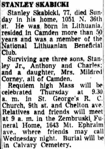 John R. Stickler, 26, airplane mechanic formerly of Camden, was killed recently in a traffic tragedy near his home at Santa Ana, Calif., according to word received here yesterday. Stickler's automobile struck a tree while he was on his way to Santa Ana from San Diego. The car apparently skidded on a curve. There were no witnesses. Stickler was born in Camden and attended schools here until 1928, when his family moved to Santa Ana. His parents, Mr. and Mrs. John H. Stickler; two brothers, George C. and Wilbert, and three aunts, Mrs. Ada Nelson and Mrs. G. Stokes, all of Santa Ana, and Mrs. Florence Hynes, of Camden, survive. His parents live at 506 McFadden Street, Santa Ana. Stickler graduated from Santa Ana High School and was well known as a baseball player there. He was employed by the Solar Aircraft Company, San Diego |