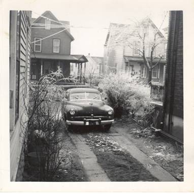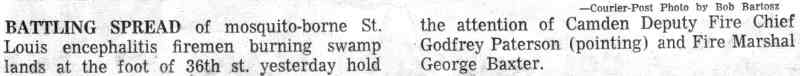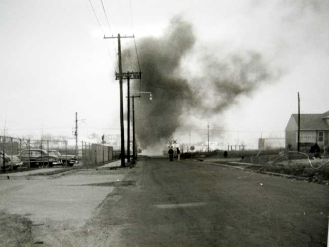 Before a bridge was built to carry automobile traffic over the railroad tracks, there was a rail crossing at street level on North 26th Street. This photo, was taken not long after the house on the right was built in 1956. The photo shows the entrance on the left to the Campbell Soup warehouse, and the residence on Remington Avenue to the right. Smoke is coming from the crossing guard's shck which was on fire. |