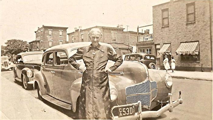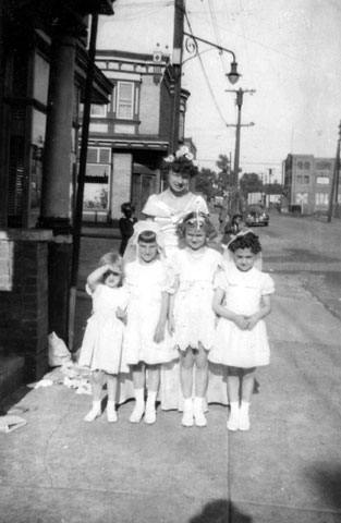 East on Viola Street May 13, 1951 This pic is taken on 6th Street at 1839, the corner being Viola. On the left is the store (1839 South 6th Street) and across the street is 1836 South 6th Street (the factory is/was 620 Viola Street- PMC). This picture was taken May 13, 1951 for the May Day Procession at the Catholic Church of the Sacred Heart. The tall woman is Dorothy Gotchel, the shorter folks from left to right are, Janis Gotchel, Marie Ekes, Patsy Gotchel, and Marie DiBenedetto. If you look closely you can see a black girl on either side of them in the back and then a black man back near the car. I also like the street lamp. Darbeau