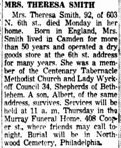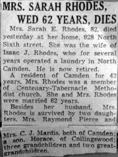 My parents moved to Camden sometime in 1940 which was the year of my birth. We lived at 829 North Sixth Street until the spring of 1948. For a few months we lived at 833 North Sixth Street as there was some delay in the closing on the house my parents bought at 609 Elm Street. I attended kindergarten at the Cassady School at 3rd and State Streets. Then I went to first and second grade at the Read School at 5th and York. From third through sixth grade I attended Northeast School at 7th and Vine. My younger brother attended Sewell School on the other corner of 7th and Vine. For junior high I went to Veterans Memorial Jr. High in Cramer Hill. After that I attended school in Philadelphia. We moved to Philadelphia in the summer after my junior year in high school. We were active members of State Street Methodist Church at Sixth and State Streets. It was a beautiful and vibrant church in those days. My childhood in North Camden was happy and normal. It was a cohesive community and a place where you didn't worry about your kids when they went outside to play. I would love to see North Camden return to some of its former status as a good place to live and raise a family. Peggy