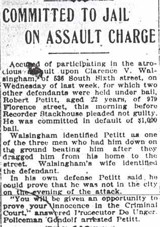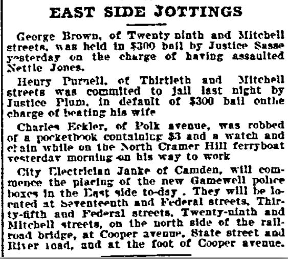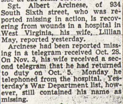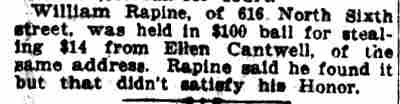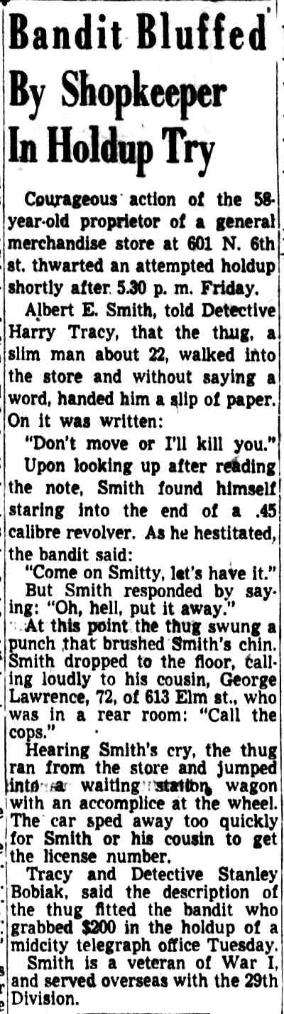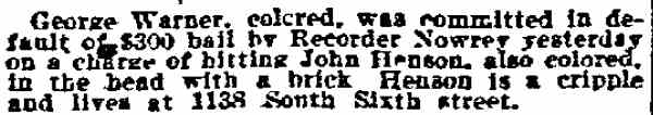 MEN ARRESTED AFTER AUTO CRASH Basil P. Cook, 44, of 449 North Fifth Street, was arrested on charges of assault and battery and threat to kill, and James Fenton, 32, of 834 North Sixth street, was held for reckless driving and disorderly conduct last night on complaint of C. N. Morrow, of 7 North Twenty-eighth Street, following an automobile accident. They will be arraigned in police court today. Cook and Fenton were booked as "drunk" by Sergeant Stiles Whittaker, though Morrow declined to press such charges against them. Fenton was released later on $40 security. Morrow was driving west on Federal Street and Fenton, in whose car Cook was passenger, was proceeding east. Fenton's car turned left into Leonard Avenue. Morrow charged that Fenton then backed into Morrow's car. Morrow got out of his car and an argument ensued. Morrow is alleged to have accused Cook and Fenton of being drunk When Morrow went into a nearby store to telephone for police, Cook is alleged to have followed him, grabbed him by the throat and threatened to kill him. Morrow then struck Cook and broke his hold. When the Third district police patrol arrived, Cook was standing in the street. He was arrested by Patrolman Elwood Humphreys. Fenton ran into the store and refused to leave. He was dragged from the place by Patrolman Joseph Shreeves. |