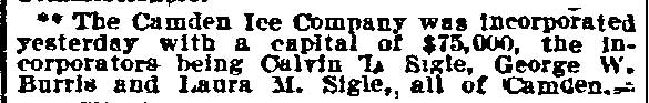 1911-1913 Camden Ice Company Calvin L. Sigle Philadelphia Inquirer |