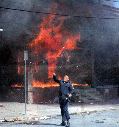 & 907 North 7th Street circa 1994 On scene: Camden police Sgt. Anthony Martino. who happened to be in the 900 block of North 7th Street just as a fire started in row homes. warns pedestrians and motorists to stay clear of the area.