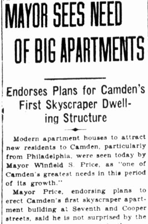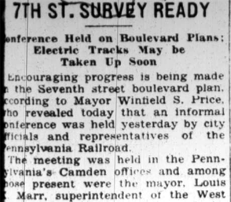SEVENTH STREET was one of Camden's original streets, and over the years expanded far beyond it's original length, now running south to north, with a few major interruptions, from Morgan Boulevard to Pyne Point in North Camden. There are three major sections to Seventh Street; from Federal Street north the Pyne Point; from Benson Street south to Kaighn Avenue, and from Van Hook Street south to Morgan Boulevard. In the early 1940s, during World War II the Chelton Terrace public housing project was built, with homes in the 2100 block of South Seventh, between Chelton Avenue and the railroad tracks that run east from Broadway along Bulson Street. These homes were owned and operated by the Housing Authority of the City of Camden. Homes and business along Seventh Street between Van Hook Street and Ferry Avenue were razed in the early 1950s to make way for the Roosevelt Manor public housing project, also owned and operated by the Housing Authority of the City of Camden. Roosevelt Manor is slated for demolition in late 2004 and 2005, and new construction is expected to take place. |
