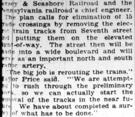 EXTENDS PACT FOR TRACK REMOVAL The city commission yesterday afternoon extended for another year a three-year-old agreement entered into by the Pennsylvania Railroad to remove its Seventh Street tracks in Camden and thereby eliminate 14 grade crossings. The extension in time was voted when the commission passed on final reading an ordinance introduced several weeks ago. It is the latest of several extensions granted to postpone start of the work. City Solicitor e. g. c. bleakly said the delays have been agreed to by the city and the railroad because the latter is not prepared at this time to carry out the project and because the city has no money. Under the agreement, the railroad was to abandon use of the Seventh Street tracks and the city was to purchase the right of way from the railroad for use as a boulevard at a cost of $286,000. The railroad is to receive a first payment of $106.000. The city-railroad plans called for electrification of the Tenth Street steam railroad over which the shore trains now using Seventh Street will run. |