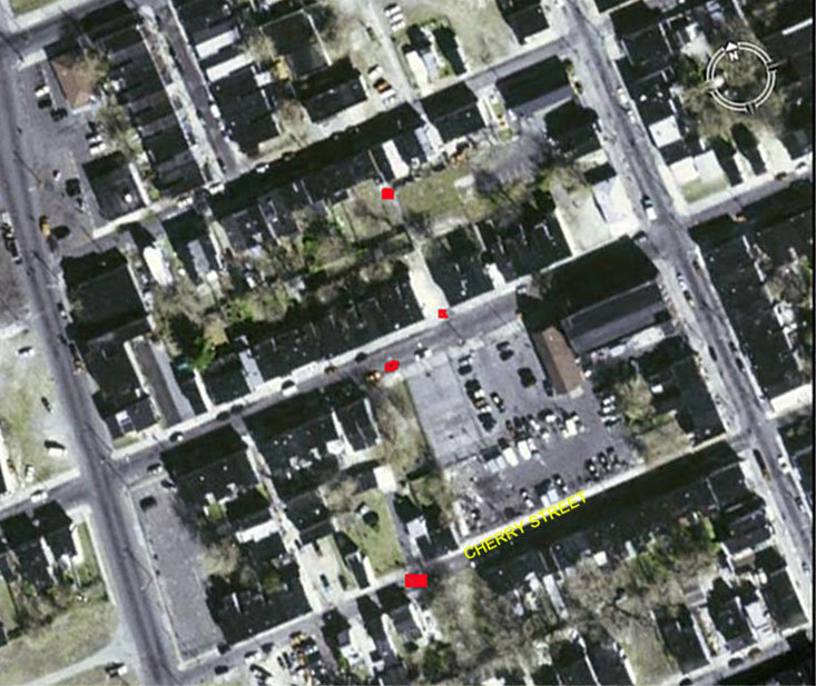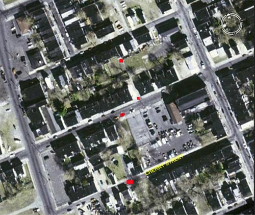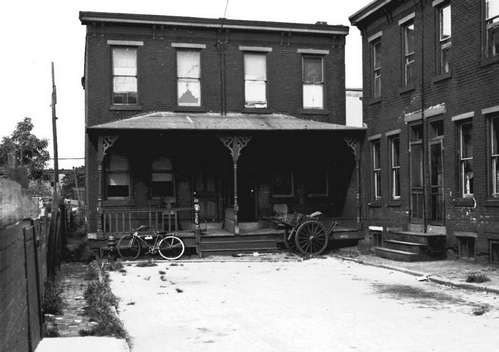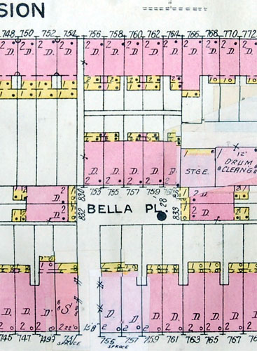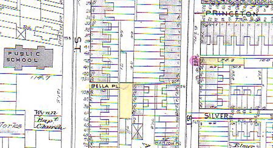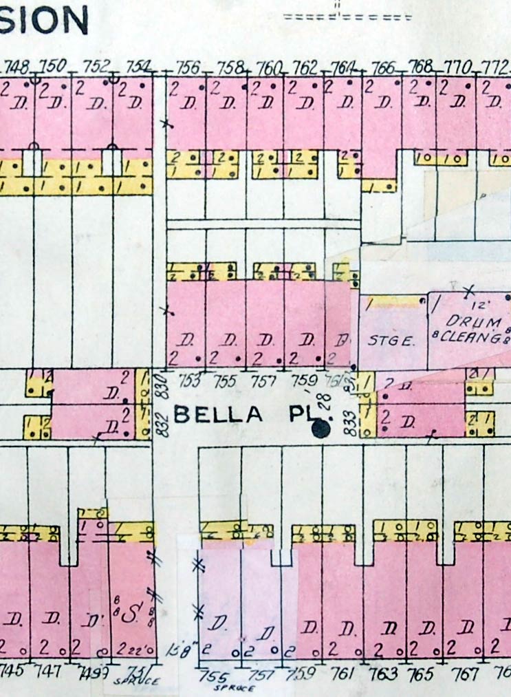 BELLA PLACE is an L-shaped court that at one time had nine houses, that ran north from 751 Spruce Street, with a narrow alley that ran from the court to 754 Division Street . Access from Spruce Street was through an alley that could accommodate a car or wagon. Access from Division was narrower, for pedestrian traffic only. As of 2004 there are no houses left on Bella Place. There is no access from Division Street, as one of the homeowners has gated the alleyway. All that remains of Bella Place is a lone telephone pole between Spruce Street and Division Street, that serviced the homes, two each on the east and west ends, and five on the north end, that once were there. |
