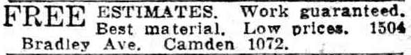 Painting & Paperhanging PAPERHANGING — Rooms prepared by experts for 33 years. Guaranteed workmanship. 1504 Bradley Ave. Phone Camden 1072. |