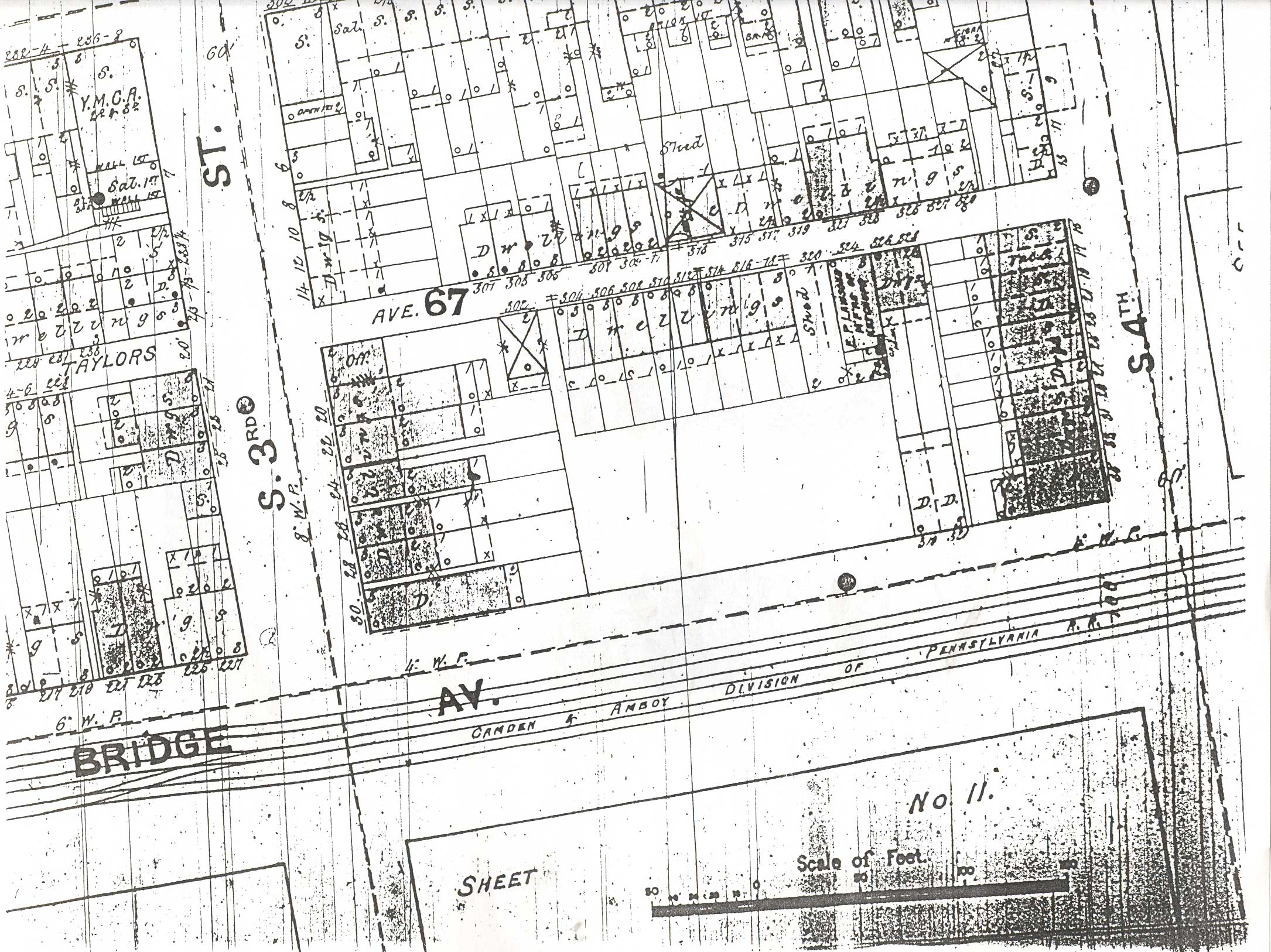 Bridge Avenue is all but a memory today, but at one time it was one of Camden's most notable thoroughfares. It lay between Federal and Mickle Streets. There were buildings on both side of Bridge Avenue as far east as South 5th Street in the 1890. By 1924 Bridge Avenue ran on the north side of the railroad tracks that started at the Market Street Ferry, with Mickle Street running parallel on the south side of the tracks. By 1924 Bridge Avenue below South 5th Street was gone. The street then began at Hudson Street and ended at Broadway, then began again at South 8th Street east for one block. By 1947 only the block east of South 8th Street was left, and it has been gone for many years. Today what was Bridge Avenue is part of the property at the rear of the Police Administration building. |