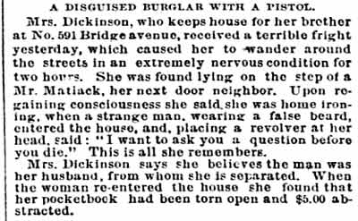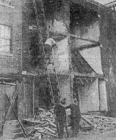 weakened by vandals who had stripped the interiors of White was sitting on the front steps of 829 Bridge Avenue when the front walls of the three-story brick buildings caved in. One of the falling bricks stunned him and the weight of the others dropped him through the porch and into the cellar. Lee Hackney of the Carman Street address had left the spot a short time before, He and Spencer Hunley of 843 Bridge Avenue, extricated White from the ruins. Sergeant Edward Carroll and a detail of patrolmen roped off the front of the damaged area while firemen were engaged in razing the remaining sections of the structures. White's condition was not believed to be serious, according to hospital attaches. |