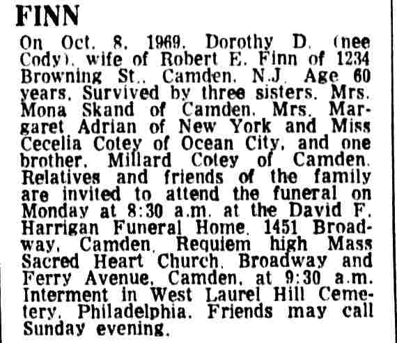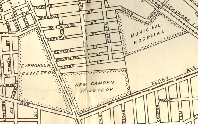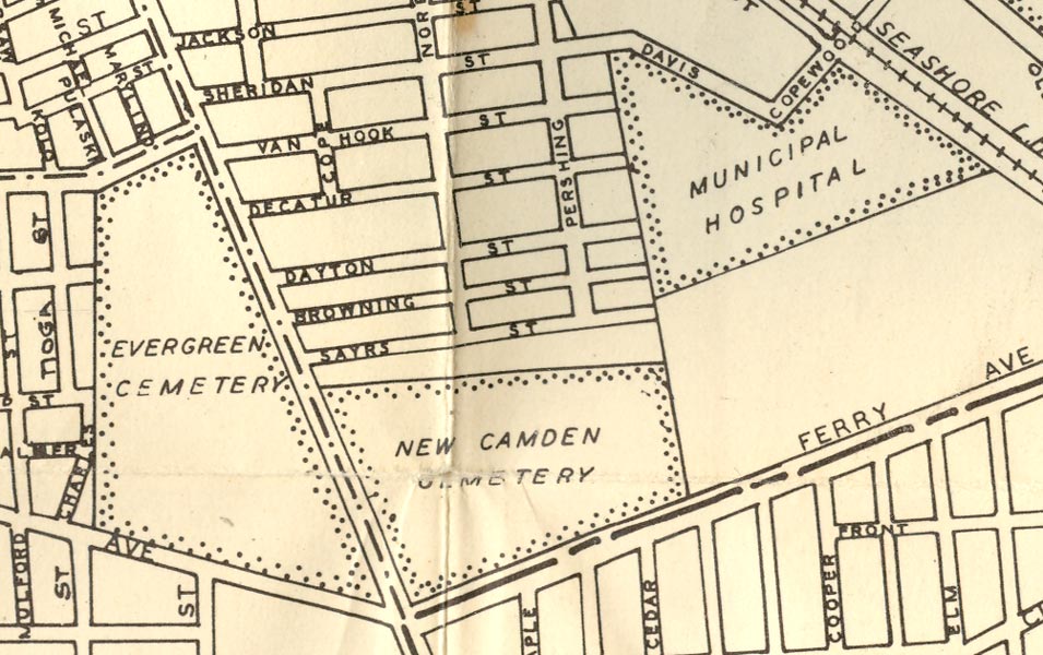 BROWNING STREET was originally known as Evergreen Avenue, and runs east from Mount Ephraim Avenue opposite Evergreen Cemetery, and was probably laid out as early as the 1890s. Evergreen Avenue appears in the 1906 Camden City Directory, and can be found on the map below, published in 1914. On March 4, 1920, Congressman William J. Browning passed away while performing his duties at the Capitol Building in Washington DC. Shortly after his death, Evergreen Avenue, which at that time had no buildings erected on it, was renamed Browning Street in his memory. When the 1924 City Directory was compiled, there still had been no homes built on Browning Street. Construction soon came, and by 1947 many homes stood in the 1300 and 1300 blocks. |