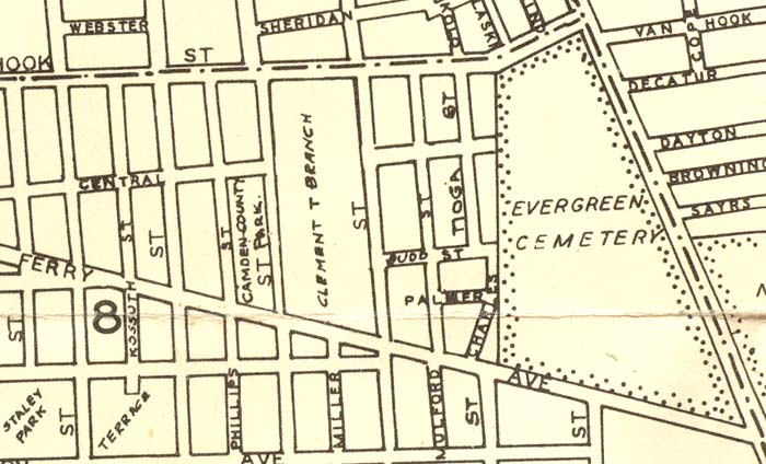 BUDD STREET is in Camden's Centerville neighborhood. It first appeared in City Directories in 1878. The first year that a house appeared with a Budd Street address, however, is 1891. A 1914 map shows Budd Street running east from Ninth Street to the rear fence of Evergreen Cemetery, between Ferry Avenue and Central Avenue. The 1906 Camden City Directory shows Budd Street beginning at Miller Street, however. The construction of the Clement T. Branch Village public housing project, which opened in 1940, further shortened Budd Street, which now begins at South 10th Street. |