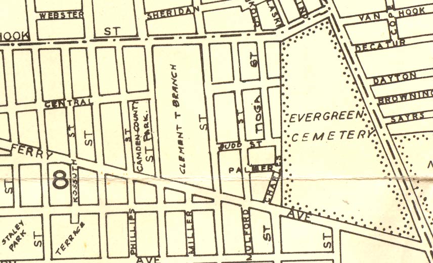 1914 Budd Street runs east to the western edge of Evergreen Cemetery on this map |