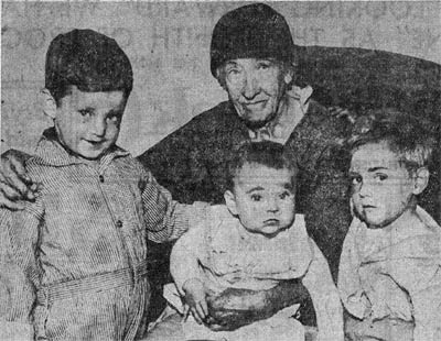 Twin brothers, 5, and their sister, 9 months, were rescued yesterday from their North Camden home by their father, and great-grandmother from a fire caused by the upsetting of a flaming bucket of gasoline into which a lighted match had been thrown. The blaze, in a rear shed of the home of Mrs. Mary Havlick, 74, of 253 Burns Street, great-grandmother of the children, also ignited the adjoining dwelling of William Bolopue, a huckster, at 251 Burns Street. The Bolopue family was not at home. The fire occurred shortly after 11 a. m. Albert Weller, the father of the children and grandson of Mrs. Havlick, told firemen that the fire started after he had carelessly tossed a lighted match into a pail of gasoline which he had drained from his auto-mobile in the rear of the house. When weller tried to extinguish the blaze in the pail, he told firemen, he stumbled over and upset it. The flames caught afire the shed at the rear of the house. Slamming shut the shed door to cut off the draft, weller seized his twin boys, Russell and Albert, Jr., Mrs. Havlick snatched the baby, Doris, from a high chair. The grandmother and her grandson took the children to the home of a neighbor, Mrs. Mae Bard, 252 Burns Street. Meanwhile, someone had sent in a fire alarm, and firemen arrived in time to put out the fire in both houses before much damage resulted. During the blaze, Mrs. Jessie Weller, mother of the children, was visiting the headquarters of the Emergency Relief Administration to apply for more food for her babies. |