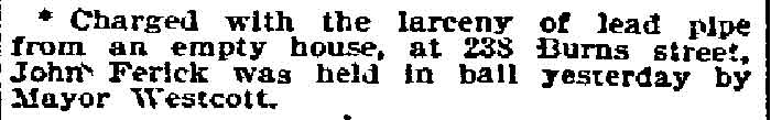 Leo O'Brien, 30, of 213 Burns street, according to Detectives Walter Smith and John Trout, refused to stay put when taken home three times so they put him behind the bars Tuesday night to await a hearing. The detectives said they found him creating a disturbance near his home and each time they took him home he would reappear to make more noise. "Where was this party where they served such awful liquor?" Judge Pancoast wanted to know. O'Brien couldn't remember. So Judge Pancoast said: "Well, perhaps you will be able to remember during the next 30 days while you are staying put in the county jail." |
