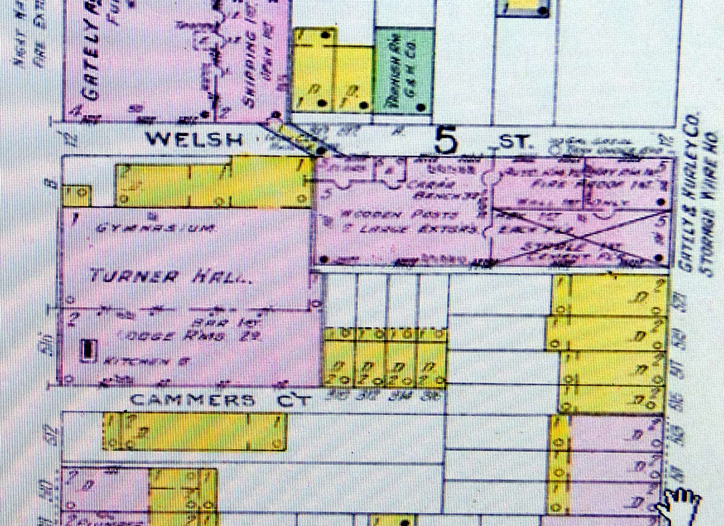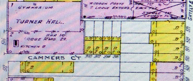 CAMMER'S COURT is listed in Camden City Directories as Dudley's Court in 1863, and was listed that way in City Directories through 1883. In the 1870s some listings began to be shown as Cammer's Court. The 1884 City Directory and 1885 Sanborn Map show the street as Cammer's Court. Cammer's Court ran south from Pine Street for one-half block between the dwelling at 512 Pine Street and the Turn Hall, also known as Turner Hall and Turn Verein Hall, at 516 pine street. The 1885 Sanborn Map shows a single building "Tenmnt", most likely a tenement, on Cammer's Court. 1891 Sanborn Map shows that four house had been built on that spot. Another name change seems to have taken place, as beginning in 1913 the street began being referred to in City Directories as Cramer's Court. The street does not appear in City Directories after 1917. It appears to have been "consumed" along with the Turn Hall when the Hurley Store at Broadway and Pine Street built a warehouse at the rear of the store, along Pine Street, west of Welsh Street. |