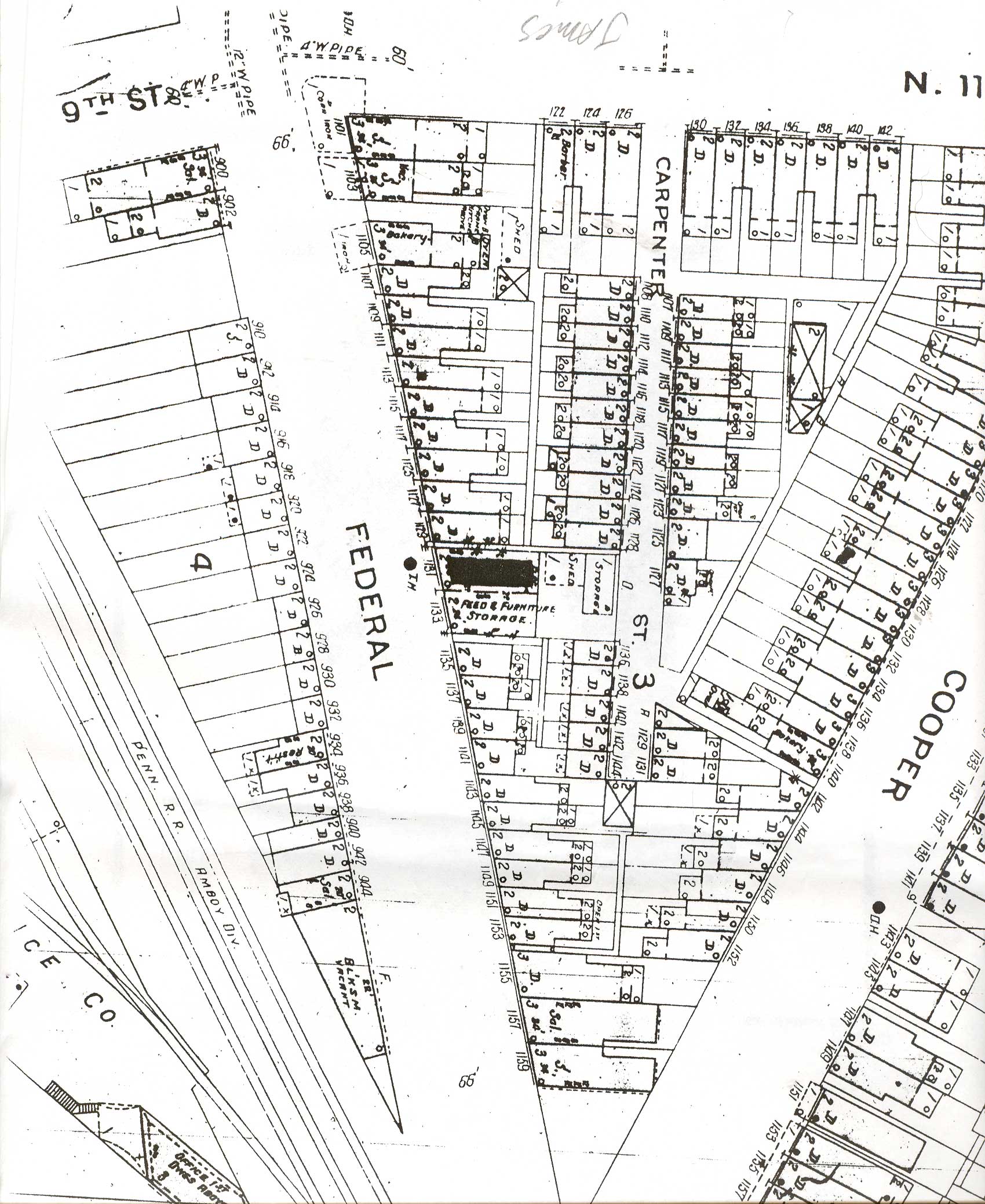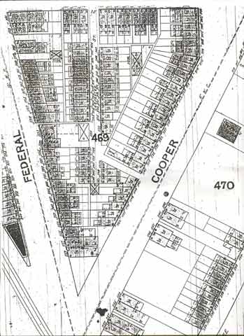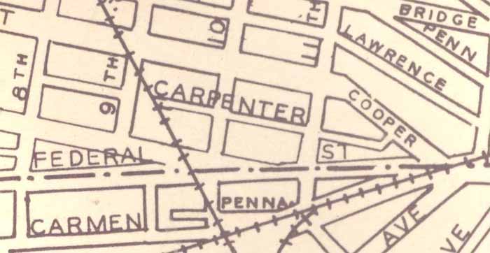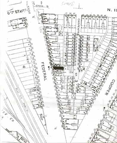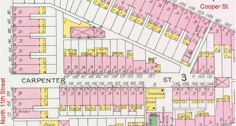 CARPENTER STREET first appears in City Directories in 1867. The street is not listed in the 1863-1864 Directory. Carpenter Street was a narrow street originally ran from 118 North 8th Street eastwards until it ran into Cooper Street where Cooper angles towards it's intersection with Federal Street near the Cooper River bridges. An alley adjacent to 1129 Carpenter Street provided access to Cooper Street. Carpenter Street at one time was interrupted at North 9th Street by the Hollingshead Factory and a railroad crossing. The Hollingshead factory was destroyed on July 30, 1940 in a spectacular fire. Several homes in the 900 block of Carpenter Street went up in flames with the factory. By 1947 only one family that had been living on Carpenter Street in 1924 was still living on the street. In later years most of Carpenter Street beyond North 9th Street was razed to make way for Interstate 676. Today virtually all that remains is the 800 block, with no buildings standing on it. For many years Carpenter Street was best known as being "the alley behind the Towne Park Motel". |