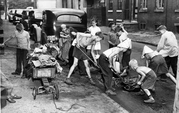 Camden Courier-Post - July 20. 1949 Tired of playing in dirt and filth littering the thoroughfare, children in the 800 block of Carpenter Street are shown cleaning it after they organized their own volunteer brigade. The youngest of the cleanup squad, two-year-old Howard Handy, is shown in the arms of his sister Patsy, 9 (at rear of automobile). The children, numbering about 20, started the job at 8 a.m. and had the street spic and span four hours later |