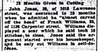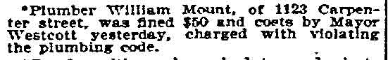 Judge Pancoast Proves to 2I That Honesty Is Best Policy If there’s a nything Police Judge Pancoast doesn’t like it's to have people trying to fool him, he said. So yesterday Pancoast sent two alleged speakeasy inmates to jail for 6o days and gave the confessed proprietor only 50 days. Emil Hatter, 35, of 829 car penter Street, was arrested for violating the ordinance prohibiting congregation of disorder1y persons on the premises by Lieutenant Herbert Anderson Thursday. Hatter told the court that he was proprietor and was in the illegal liquor business to provide for his two children. "That's no excuse," said the judge, "you should provide for them without breaking the law." He fined Hatter $50 and sentenced him to 50 days when he was unable to pay. The judge then turned to Edward Mackay, 38, of 531 ray street, and Alfred Brooks, 45, of 700 Pearl Street [wrong address - PMC], who, Andersen said, were drunk in Hatter's establishment. Both men admitted having a few drinks, elsewhere, but insisted they were sober and that they did not buy the drinks from Hatter. "I'm good and tired of having peop1e trying to fool me," said Pancoast. "I don't know what they take me for. I'm going to end it, though, by giving each of you 60 days." Unable to pay a fine of $100, George Young, 29, colored, 954 South Ninth Street, was sentenced to 100 days when he pleaded guilty to operating a "wash-boiler" still in violation of the city speakeasy ordinance. His wife, Ethel, 19, and Annie Fussel, 37, of 614 Chestnut Street , alleged inmates, were given 30 days each in default of $25 fines. |