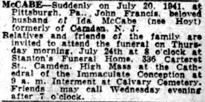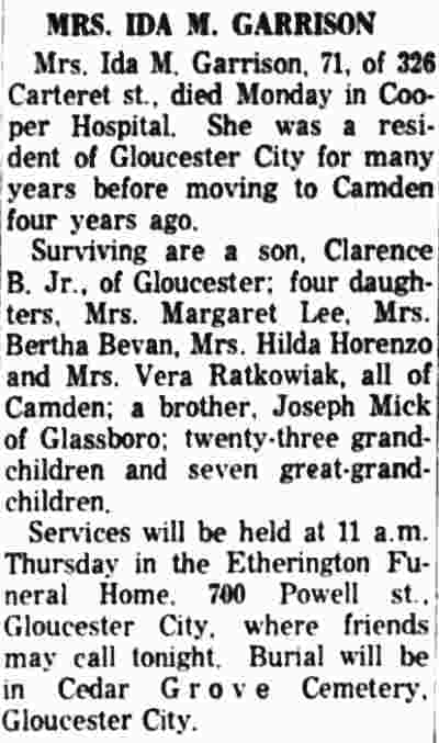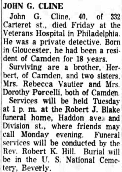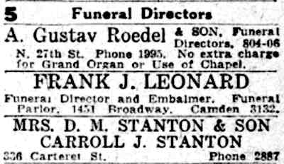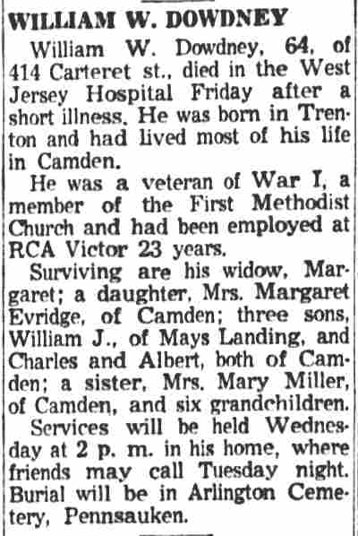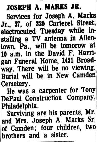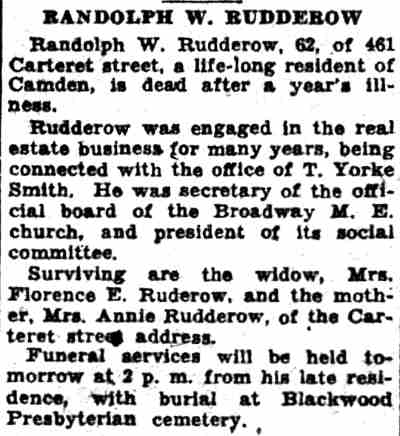 Carteret Street, in Camden's old Ninth Ward, ran just two blocks, from the old Armory (later Convention Hall) in the 700 block of Mickle Street southeast, crossing Wright Avenue, to its end at Newton Avenue. It was laid and out and houses were built along it after 1891, a stone's throw from Camden's old City Hall at Haddon and Wright Avenues. The street ran parallel to Haddon Avenue to the west, and Warren Avenue to the east.. Carteret Street fell victim to "progress", that progress being the construction of Interstate 676 that in some ways was more devastating to Camden than the building of the Ben Franklin Bridge. There were still people living on Carteret Street as late as 1969 and Carteret Street was still there into the mid-1970s. Today Carteret Street is no more, having been erased at the Mickle Street end by the parking lot that lies adjacent to the "3 Cooper Plaza" medical building and at the Newton Avenue end by the highway. |