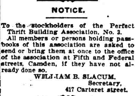 1900-1923 Camden Post-Telegram Perfect Thrift Building association No. 2 |