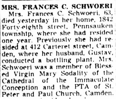 At age 81 I am the eldest grand daughter of Charles and Sarah Auerbach and can remember staying with my aunt Yetta in the family home on Carteret St. An outhouse was in the backyard but then removed. An indoor bathroom was installed on the 2nd. floor. I can remember the gas lamps being lit on the street. A park was nearby that we could walk to. Train tracks were behind the property and it was very noisy but it was fun watching the trains and learning to spell the names of the states that were printed on the boxcars. Yetta lived alone there for several years after her siblings moved away. Bessie, Freda and Frances moved to Philadelphia where as Freda worked as a secretary to the president of Kuhn and Blum curtain manufactures located in Kensington. Frances worked at Warner Brothers Cement in Philly. Bessie was ill with TB and had spent time in a sanitarium as a child and never held a job but stayed home to keep house and cook for the other two. In the early 60's these three moved to Miami when both Freda and Frances retired. They bought a house at 3120 NW 5th St. Tres (Teresa) and her husband, Joe Mazer, had moved to Miami after WWII. I moved to Miami in 1956 to go to school. Yetta sold the house on Carteret St. and bought a smaller one in East Camden where she lived until her death of uterine cancer in 1950. Sarah, my grandmother whom I am named after, also had died of the same disease. Charles passed away from pneumonia. I never knew either as they were gone by the time I was born. Issy (Isabel), before her marriage to Joe Wachtel was a grade school teacher at Garfield School in Est Camden. She lived with my mother, Flora Hazel, and father, Tanfield Kotlikoff. - Sarah Fiori, March 2019 |