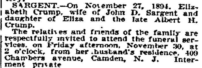MRS. EVELYN C. CONNELLY Mrs. Evelyn C. Connelly, 68, of 420 Chambers avenue, widow of a former Camden potter, died yesterday after a long illness at the Cooper Hospital. Mrs. Connelly had been a resident of Camden for 36 years. She was the widow of Martin J. Connelly, who died in 1910. Mrs. Connelly was a member of Camp No. 10, P. O. of A. She is survived by two sons, Edwin J. and William P. Connelly; a daughter, Mrs. Kathryn Noble, of Merchantville, and two sisters, Mrs. Harry Hankins, of Camden, and Mrs. John Votta, of Trenton. Funeral services will be held at 2 p. m. tomorrow at 60 South Twenty-seventh street. Burial will be in Harleigh cemetery. |