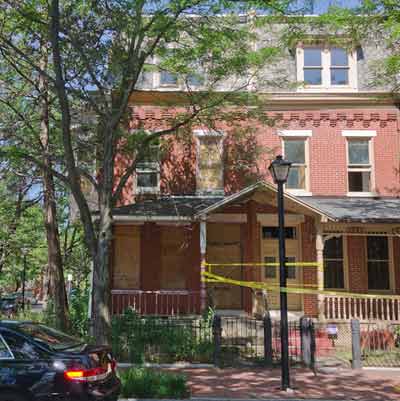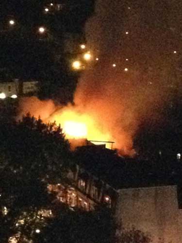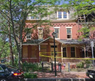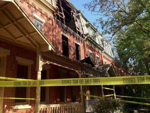 assistance from At one point, the rear of the home in which the fire started collapsed, sending bricks tumbling into the small backyards of the properties. Spray from a hose smashed a window of an adjacent home. An older female resident was frightened, but unhurt. Neighbors reported to police that a woman had