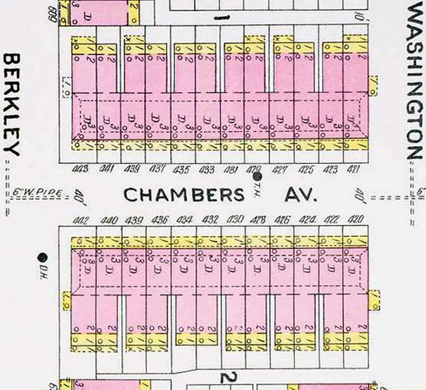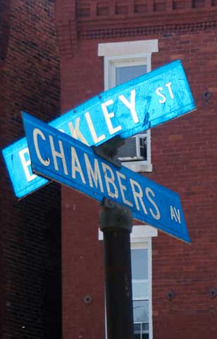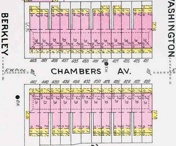 CHAMBERS AVENUE runs from Benson Street south to Berkley Street. There were 44 houses built on the street, which were erected sometime after 1890. There are no stores, although one home housed a funeral parlor for many years. The story behind the name of Chambers Avenue is not known to this author as of this writing. |