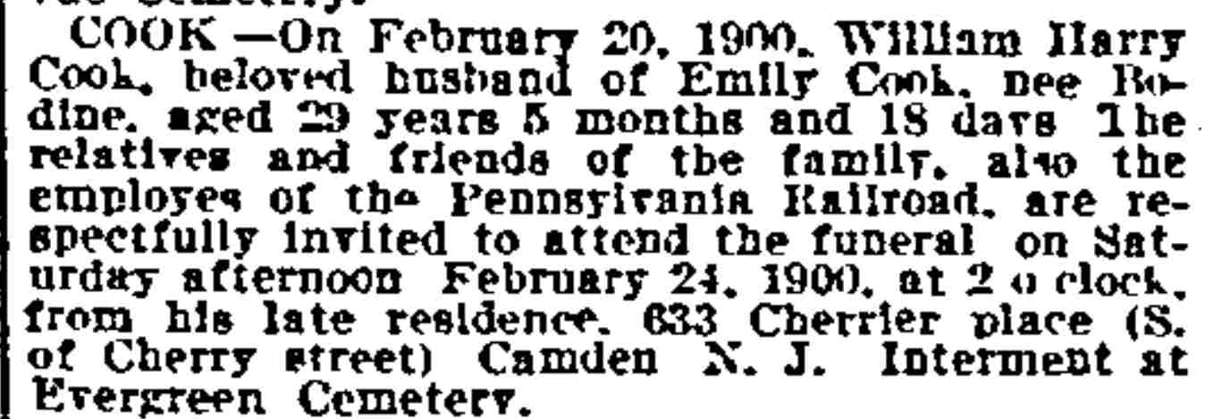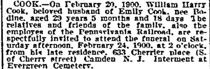 Cherrier Place, also known as Cherry Place and Cherry Court, lies south of Cherry Street, running east to west between South 7th Street and South 6th Street. Access is from an alleyway on Cherry Street. There is a fire hydrant at the west end of the block. The street first appear in City Directories in 1887. The street appears to have been named after Frederick Cherrier, a well known tobacconist in Camden who passed away in the early 1880s. |