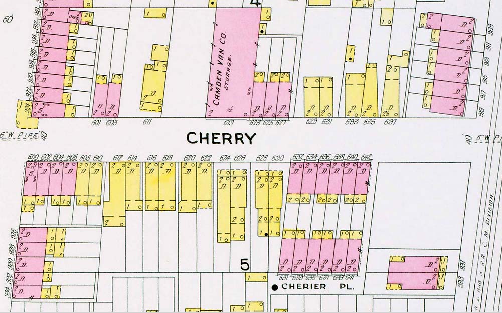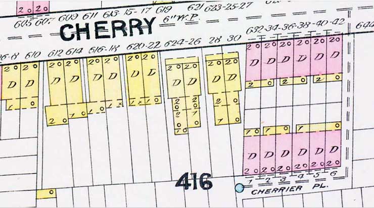 1906 Sanborn Map Cherrier Place can be found in lower right of the map, running south off of Cherry Street. The houses were renumbered in the late 1890s. |