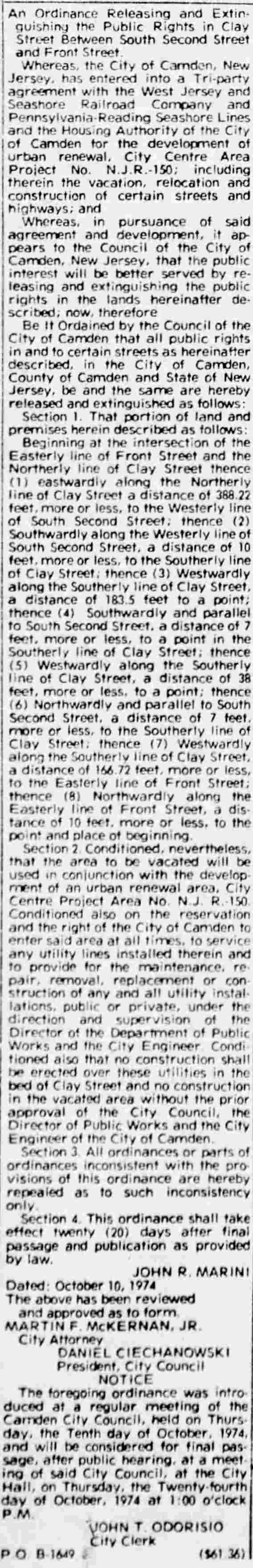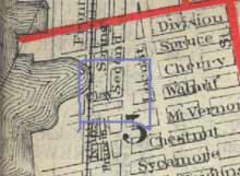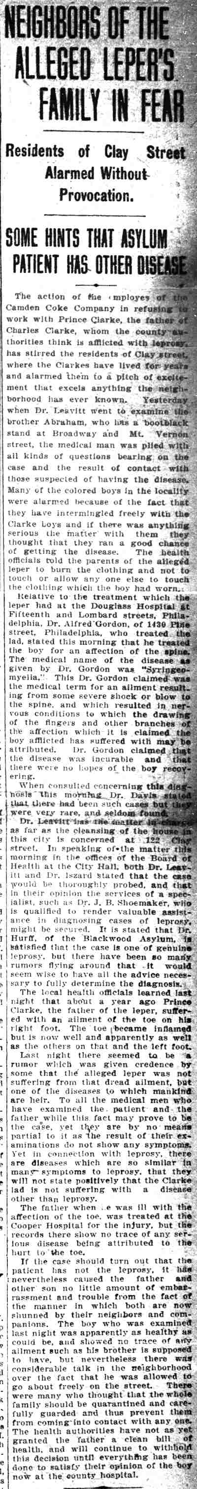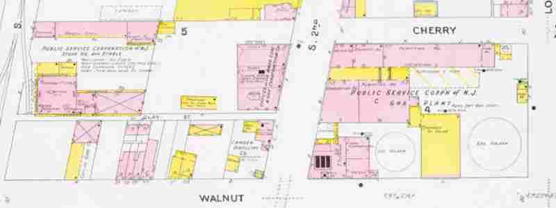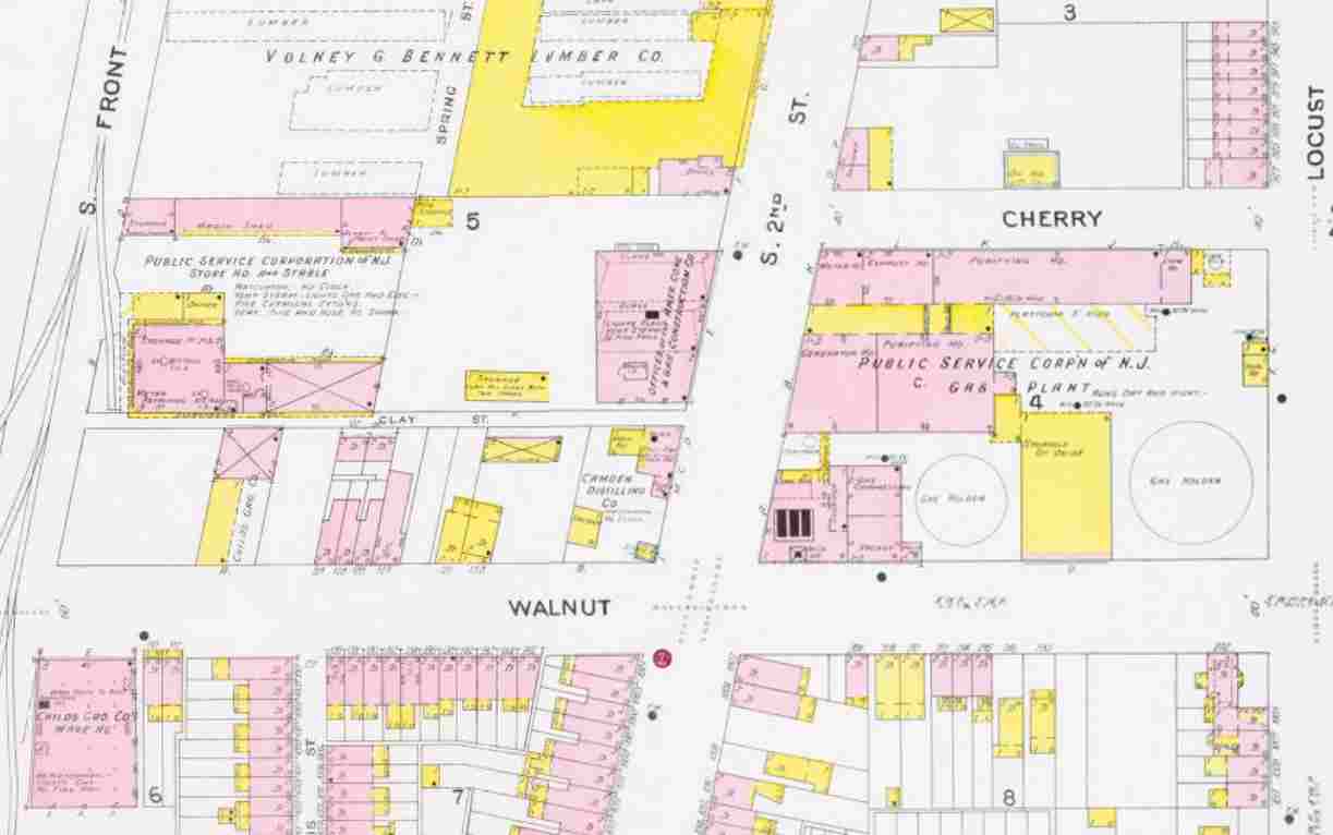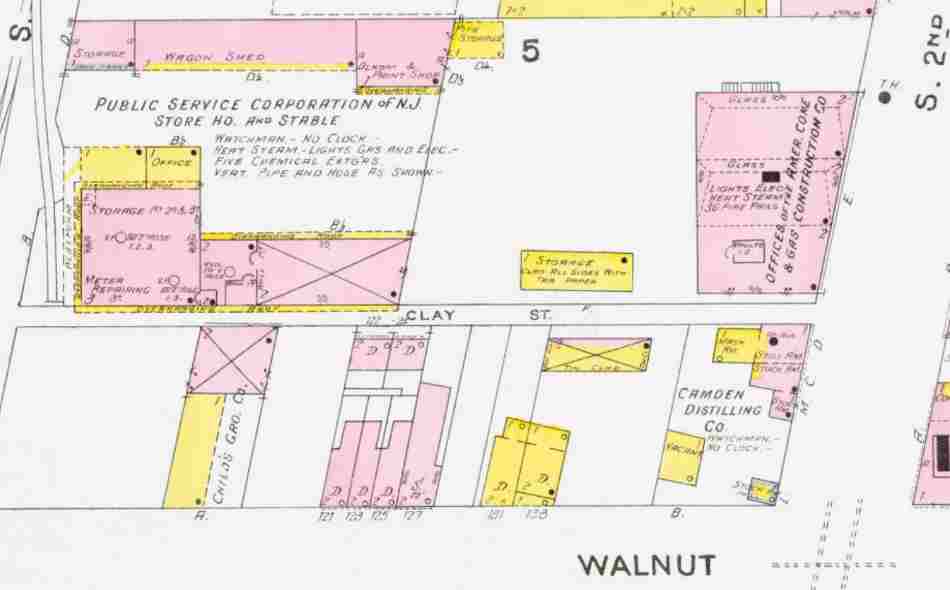 CLAY STREET, in Camden's 5th Ward, ran west from the 900 block of South 2nd Street to South Front Street. The street does not appear in the 1891 Sanborn Map, and has no listings in the 1887-1888, 1888-1889, or 1890-1891 City Directories. Its origins appear tied to the construction of the Public Service Corporation of New Jersey's gas plant on the east side of South 2nd Street between Cherry and Walnut Streets in the 1890s. A twin home of brick construction had been put up at 122 and 124 Clay Street by 1896. By 1906 Public Service has built a large storehouse and stables for its horses on the north side of Clay Street, and the S. Canning Childs grocery firm had a warehouse whose rear entrance was on the south side, at 116 Clay street. Contractor William H. Doherty had a large building at the rear of his property at 133 Walnut Street that had access to Clay Street. It is quite probable that the houses on Clay Street were built at the same time as 121, 123, 125 and 127 Walnut Street, and that it was William H. Doherty who had them erected. William H. Doherty owned land in the 100 block of Walnut Street as early as 1890, and made his home in that block of Walnut Street until he passed away in 1901. Late in 1908 Clay Street became front page news when a resident was thought to have leprosy. No residences were recorded on City Street in City Directories after 1908, although newspaper articles indicate that there were residents there as late as 1912. No homes or business had addresses on Clay Street in the 1923 or later Camden City Directories. Clay Street was officially extinguished by the City of Camden in October of 1974. All physical traces of Clay Street are gone. |
