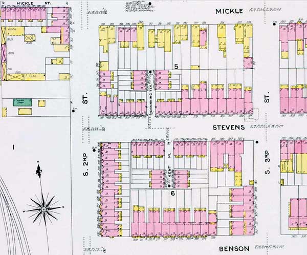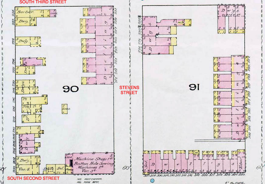 CLEVELAND TERRACE appears to have been named after President Grover Cleveland, who served from 1884 to 188 and again from 1892 to 1896. It ran from 212 Stevens Street south to a dead end. Cleveland Terrace does not appear in the 1878 City Directory but already was built when the 1887-1888 Camden City Directory was compiled. There were still homes occupied on the Terrace as late as 1947. In October of 1899 Cleveland Terrace was re-named Kent Place, similarly, at some point by 1929 the name had been restored to Cleveland Terrace. This was done to avoid confusion with Cleveland Avenue in the newly acquired Cramer Hill and East Camden sections of the city, which occurred the previous summer when the town of Stockton was annexed by Camden. Many streets in both Stockton and Camden were renamed at that time, and the name changing in the new section continued for some time thereafter. The 1906 City and 1924 City Directories and the 1906 Sanborn Map refer to Kent Place. The 1929 City Directory lists "Cleveland Terrace, formerly Kent Place, and the 1947 Camden City Directory, simply lists Cleveland Terrace. Cleveland Terrace was erased around 1970 when the Royal Court Townhomes were erected on land between South 2nd and South 3rd Streets below Stevens Street. |