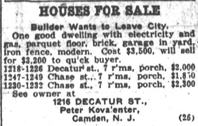 DECATUR STREET is named for American Naval hero Commodore Stephen Decatur, who played a decisive role in the War of 1812 and in America's war with Muslim pirates operating out of Tripolia nd other ports in North Africa. Decatur is also known for his quote "…our country right or wrong." Decatur Street runs from Mount Ephraim Avenue on a straight line roughly north-east towards Haddon Avenue, stopping before the railroad tracks that run parallel to Haddon Avenue at that point. Development began around the turn of the century, and the street was for the most part completely built up by 1950. Many of the early residents of Decatur Street were of Polish descent, and were members of St. Joseph's Church at 10th and Mechanic Streets. Like virtually all other streets in Camden, Decatur Street was always ethnically, if not racially, mixed. Decatur Street is for the most part residential. The South Camden Bakery was located in the 1200 block at one time, and at the intersection of Norris and Decatur at one time held a grocery, a bar, and a social club. The Victory Cafe stood at 1301 Decatur Street, the 13th Ward Democrat Club was across the street at 1302, and a grocery was located at 1299 Decatur Street. Bar owner Edward Zajac, who boxed professionally out of Camden as Eddie Chaney, lived at 1287 Decatur Street. The most notable building on Decatur Street was St. Joseph's High School. Shortly after World War II, St. Joseph's High School was erected at the corner of Mount Ephraim and Decatur Street. The school was abandoned by the Diocese of Camden around 1979, and stood vacant and open to the elements, drug dealers, squatters, and other undesirables for many years before it was acquired and converted into the Dayton Manor nursing home. The presence of the empty building, combined with the flood of drugs into Camden in the mid-1980s, and other social factors combined to the overall decline of Decatur Street and the surrounding neighborhood. |