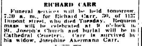 An 18-year-old baby sitter ran with her three-year-old charge Monday afternoon from a blazing residence at 1145 DuPont Street in the Cramer Hill section. Bertha Reed, 928 North 21st Street, was watching Michael Moran, while the child's mother, Mrs. Mary Moran, was out. At 3:55 PM, Miss Reed saw smoke curling up from the living room floor. She quickly put Michael's outdoor clothing on him and ran with him to the street. Engines 9 and 11 and Truck 3 responded to a box alarm pulled by a neighbor. The firemen found flames had eaten through a partition in the house to the second floor. They donned gas masks before entering the blazing structure. The fine spread to the basement and first floor of 1143 DuPont Street occupied by Mrs. Moran's mother, Mrs. Anna Abel. who was not at home at the time. Main damage was to the dining room of the Moran residence. District Fire Chief John Graham said wood piled near a coal stove in the basement had ignited and had fired the partition of the two-story twin, frame dwelling. |