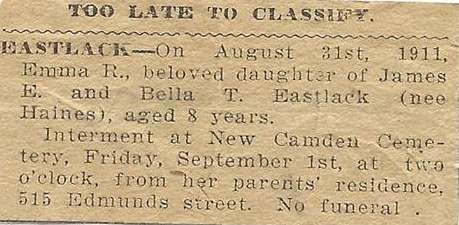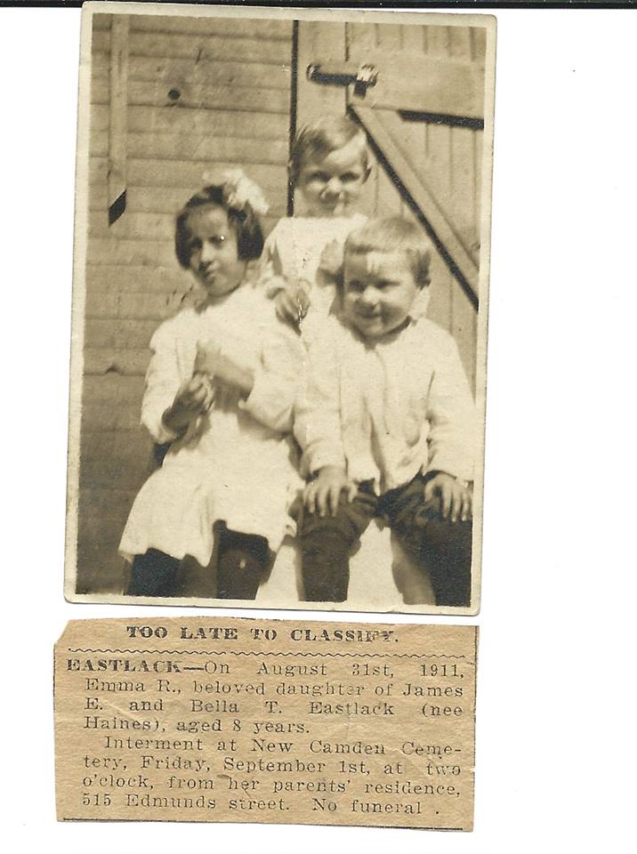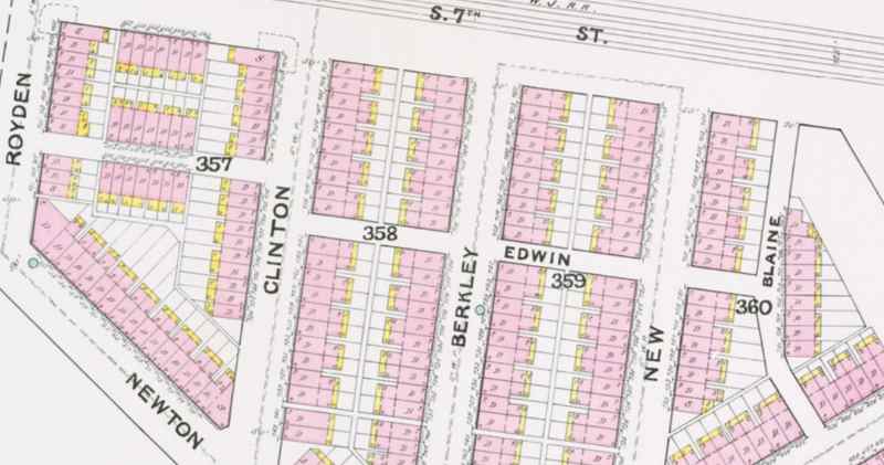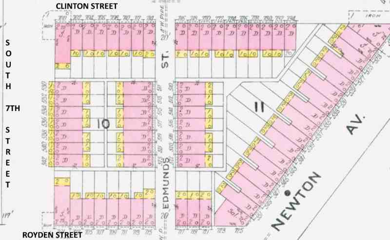 EDMUNDS STREET, which still exists but today appears on no maps, ran as an alley with no homes fronting on it from Blaine Street south to Clinton Street, then picked up about 50 feet west on Clinton Street and runs south for one block to Royden Street. Edmunds Street appear in Camden City Directories in 1887. By 1891 fourteen homes were built on Edmunds Street, which appears on that year's Sanborn Map as Edwin Street. Five of these homes were still standing in 1947, none, had listed phone numbers in 1969. Today Edmunds Street runs from Blaine Street to New Street, where it is interrupted by The Cooper Building condominium apartments, then resumes midway between New Street and Berkley Street and continues to Clinton Street. The last section of Edmunds Street, from Clinton Street to Royden Streets, was erased in the late 1990s or early 2000s in order to build a public park, which unfortunately for a time shortly after construction became a hangout for local drug dealers. |