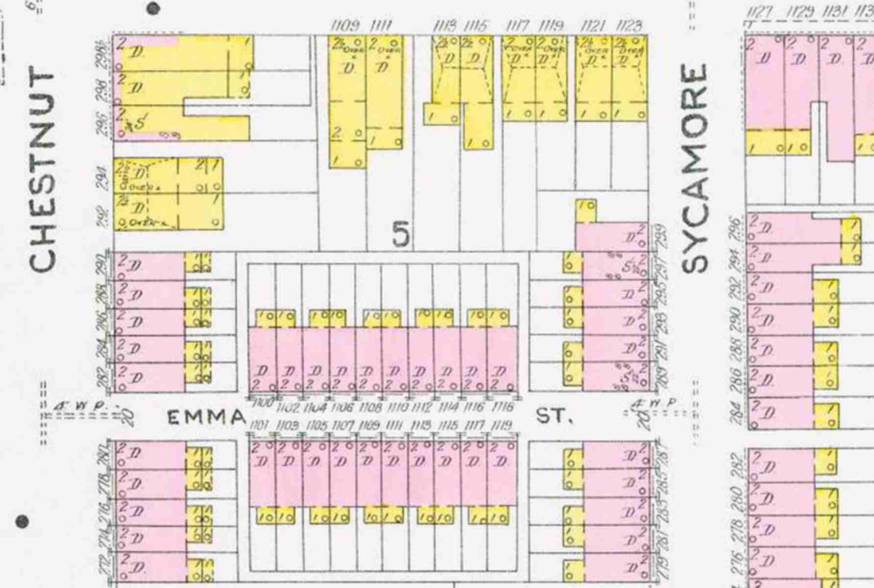 EMMA STREET was a one block street that ran from Chestnut Street south to Sycamore Street, east of Locust Street and west of South 3rd Street. There were 20 houses on Emma Street, numbering 1100 through 1119. Emma Street was already in existence and the houses had already been built when the 1885 Sanborn Map was published. All but one house on Emma Street was occupied in 1947. Over the years all but one was abandoned, several abandoned properties were taken down in the 1990s. By 2014, only one house still stood on Emma Street, and it was at that time still occupied. |