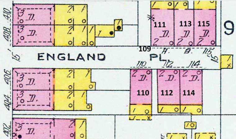 ENGLAND PLACE, also known as England's Place, is a short street that ran for half a block from 408 North Front Street until it came to a dead end. Homes are first listed on England Place in the 1878 City Directory. The 1885 Sanborn Map shows five homes on England Place, 111, 112, 113, 114, and 115. By 1891, 110 England Place had been built. At some point after 1906 a building was erected at 109 England Place that was used over the years as a machine shop and as an auto repair garage. There were still occupied homes on England Place as late as 1969. By 1980 they were gone. Today England Place is no more, the land in which it occupied is now a city park. |