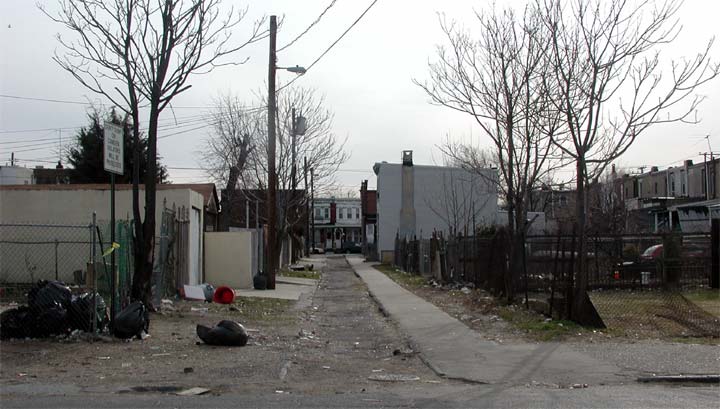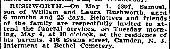 EVANS STREET originally ran from 53 South 2nd Street eastward to West Street, between Clinton and Royden Streets. Houses were built on the South side of Evans Street. The one building on the north side, at 407 Evans Street, belonged to E.W. Howell, a carpenter and builder who lived for a few years at the immediate rear, 408 Clinton Street. It appears from the 1906 Sanborn Map that no lots were ever drawn out in the 200 Block of Evans Street. This block and the 200 blocks of all other streets between Clinton Street and Kaighn Avenue have over the years been converted to industrial and commercial use. By 1885 houses had been built in the 400 Block, according that year's Sanborn Map. 326, 328, 330, 332, 334, 336, 338, & 340 Evans Street were built between June of 1885 and April of 1891. 310 through 324 Evans were built by 1906 and 306 Evans was under construction in April of 1906. As of the summer of 2012 only two buildings still stand on Evans Street, The old builder's shop at 407 Evans and one dwelling at 426 Evans Street. |