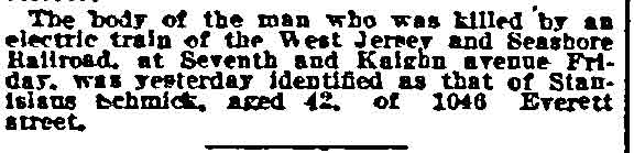 Alarms of Fire Before and After Carrigan Funeral Just before Camden firemen were planning to leave headquarters yesterday to march to the home of Captain Martin B. Carrigan, who lost his life in the falling roof at the Economy Store fire, they were summoned to a three alarm fire at the stables of Hugh A. Greenan, 1736 South 7th Street. When Engine Companies No. 7 and 8 reached their fire houses this morning after the Carrigan funeral, an alarm was received from the drugstore of W.J. Grobiowski, 1250 Everett street. The Grobowski fire had its origin in a pile of rubbish in the basement and was extinguished with a small loss. |