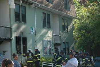 Firefighter Pete Carbone kneeling. Battalion Captain Chip Ayers with back to camera. |