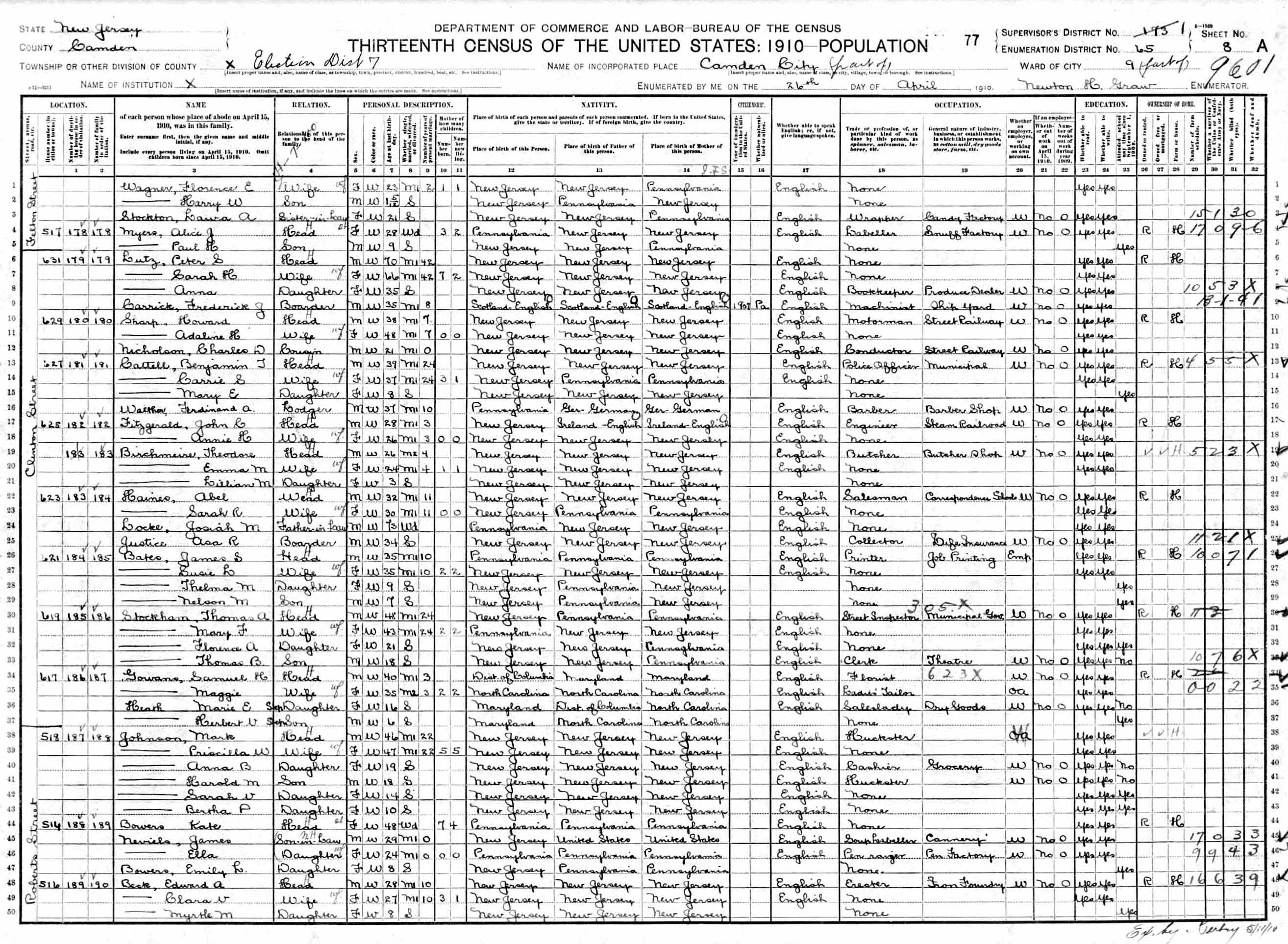 FELTON STREET was a very short street that ran south from Clarion Street to Clinton Street, between South 6th Street and Roberts Street. Clarion Street, or as it; is referred to more commonly, Clarion Alley, runs east from South 5th Street to South 6th Street, between Berkley and Clinton Street. It appears to have been developed by Camden insurance and real estate broker Charles H. Felton, who was very active in Camden in the 1870s and 1880s. He died at the age of 32 in November of 1887. Water pipe was laid out for Felton Street in 1883. Felton Street first appears in Howe's Camden City and County Directory 1884-1885 , with a Lewis White living at 518 Felton Street. There were eight homes on Felton Street, four on a side, and at seven were occupied as late as 1947. There were no addresses with telephone listings on Felton Street in 1969, and the street is not mentioned in the 1980 Directory. No buildings are standing as of the fall of 2011. |