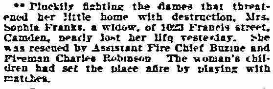 'FORGOTTEN' HOLDUP RECALLED IN CAPTURE OF FIFTH AS BANDIT Police last night cleaned up an old case of highway robbery that occurred at Second and Mt. Vernon Streets last August when Edward A. Turner, 48, of 1104 Cresson Street, was robbed of his watch, chain and knife. At the time of the hold-up, Turner told police there were four or five colored men in the robbery. Detectives robert ward and Clifford Carr arrested earl bundy, 17, of 819 Sycamore Street, who they said had the articles in his possession; also Charles Wing, 17, of 1012 Francis Street; Sherman Smith, 17, of 1061 Ivins Street and William Jackman, 16, of 152 Sycamore Street. The last three pleaded guilty and were sentenced to Rahway Reformatory by Judge Samuel Shay. Bundy pleaded not guilty and was lodged in the local jail. Last night Ward and Carr with Patrolman Luke captured Oscar Moore, 19, of 135 mt. vernon street as the fifth bandit. He will be held without bail on the same charge as the others.. |