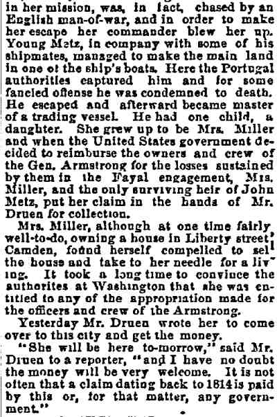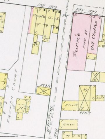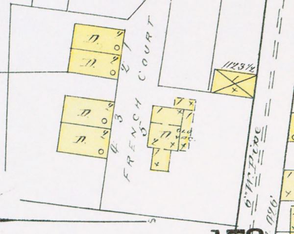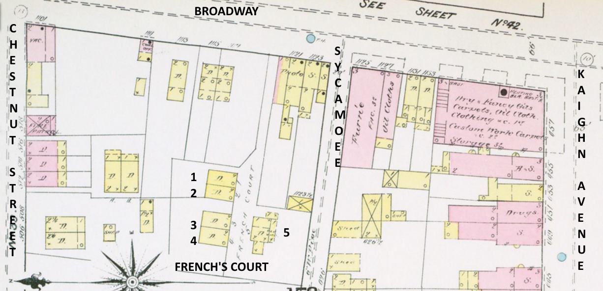 FRENCH'S COURT was a small street that ran west from 1021 Broadway. Originally known as French Street. it appeared as early as 1850. Sometime between 1863 and 1867 it was renamed French's Court, and was still being listed in directories as late as 1922. There were four frame buildings on French's Court in 1891, all were gone by 1906. A Mrs. Miller, who in 1891 won a settlement going back to the War of 1812, lived on French's Court, as did murderer Isaac Merrick. |