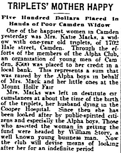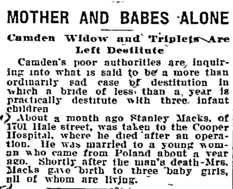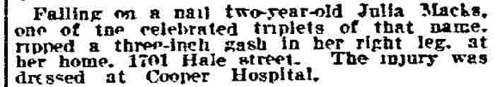 HALE STREET ran North to South between Central Avenue and Ferry Avenue, west of the railroad tracks that still exist today. It first appears in Camden City Directories in 1895. Four homes stood on Hale Street. The were originally numbered 1701, 1703, 1705, and 1707. St some point between 1913 and 1920 they were renumbered 1800, 1802, 1804, and 1806. These homes were still standing in 1962, and at least two, 1802 and 1806 were still occupied in 1969. In the 1970s these homes were taken, and, with all of Hale Street, erased to make way for the I-676 North-South Freeway.. |
