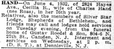 OPIEāOn October 28, 1935, of Mays Landing, N. J., formerly of 2724 Hayes Ave. Camden, Nettie, widow of James Opie in her 73rd year. Relatives and friends of the family are invited to attend the funeral services on Thursday at 2 o'clock, at the funeral home of A. Gustav Roedel & Son, 804-6 N. 27th St., Camden. Interment private at Arlington Cemetery. Friends may call Wednesday evening, 7 to 9 o'clock. |