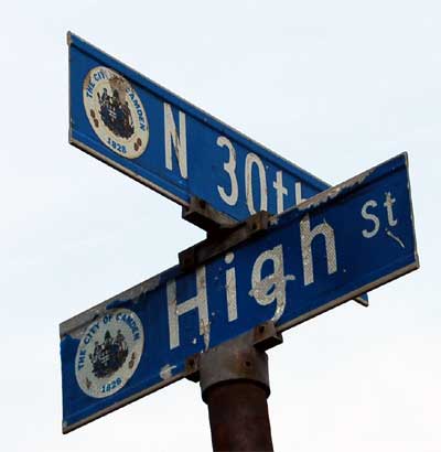 HIGH STREET runs east from 114 East State Street, parallel to Federal Street to North 26th Street, where it doglegs to the left, and continues to North 30th Street, running parallel to Westfield Avenue. High Street begins again at North 32nd Street, and runs all the way to the border with Pennsauken at North 42nd Street, from where it continues in Pennsauken all the way to Cove Road. ending opposite Arlington and Bethel Cemeteries. Outside of a few corner stores, most of of the buildings on High Street were and are residential. The two great exceptions are the Thomas H. Dudley School between North 23rd and North 24th Streets, and the Henry H. Davis School between North 24th Street and North 36th Street. From the winter of 1985 on until the present day, however, there has been a great amount of "business" activity, on the corner of North 25th Street and High Street, which has been a notorious drug corner for over 20 years. |
